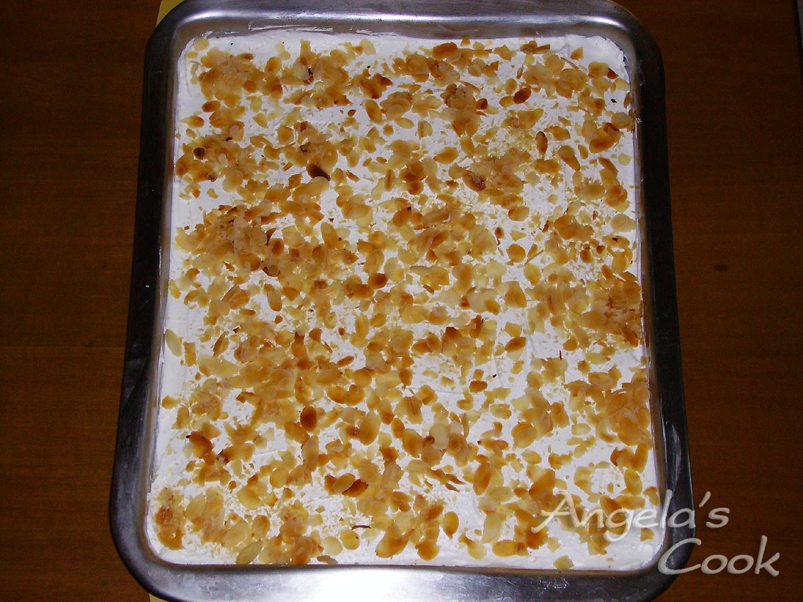 Στο μεταξύ βάζουμε όλα τα υλικά για την κρέμα μας σε κατσαρόλα, ανακατεύουμε συνεχώς μέχρι να πήξει. Αφήνουμε να κρυώσει λίγο η κρέμα μας και την στρώνουμε πάνω στο καταίφι. Βάζουμε στο ψυγείο για λίγη ώρα να κρυώσει τελείως η κρέμα. Τέλος στρώνουμε την σαντιγί και διακοσμούμε με το αμύγδαλο.