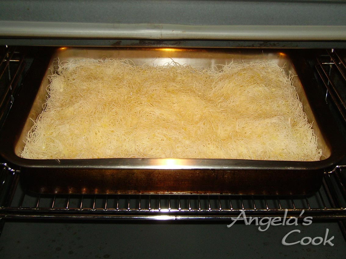 Ξαίνουμε πολύ καλά το καταίφι μας. Το βουτυρώνουμε να πάει παντού το βούτυρο και το ψήνουμε μέχρι να ξεροψηθεί και να γίνει κριτσανιστό.