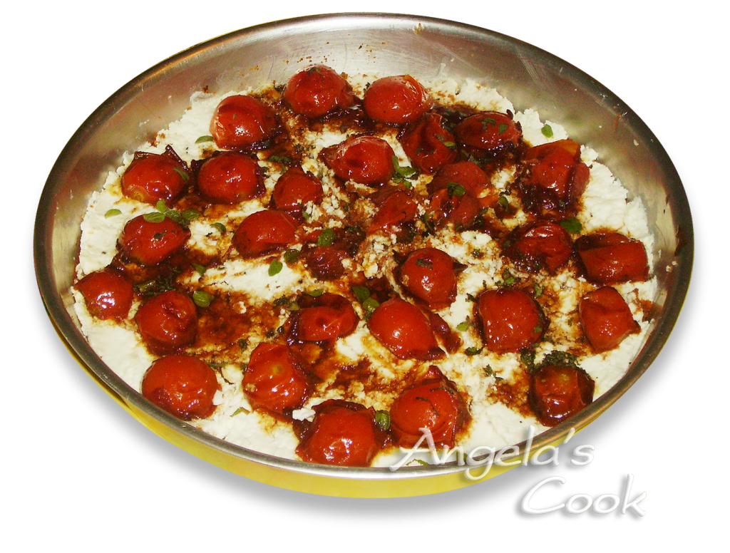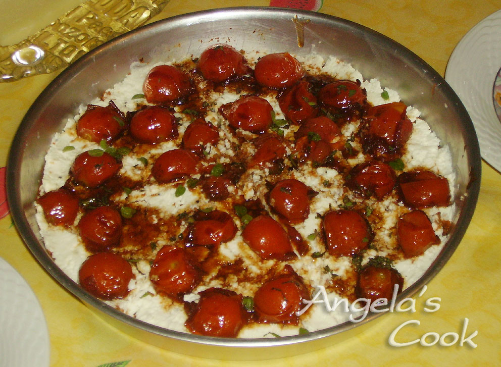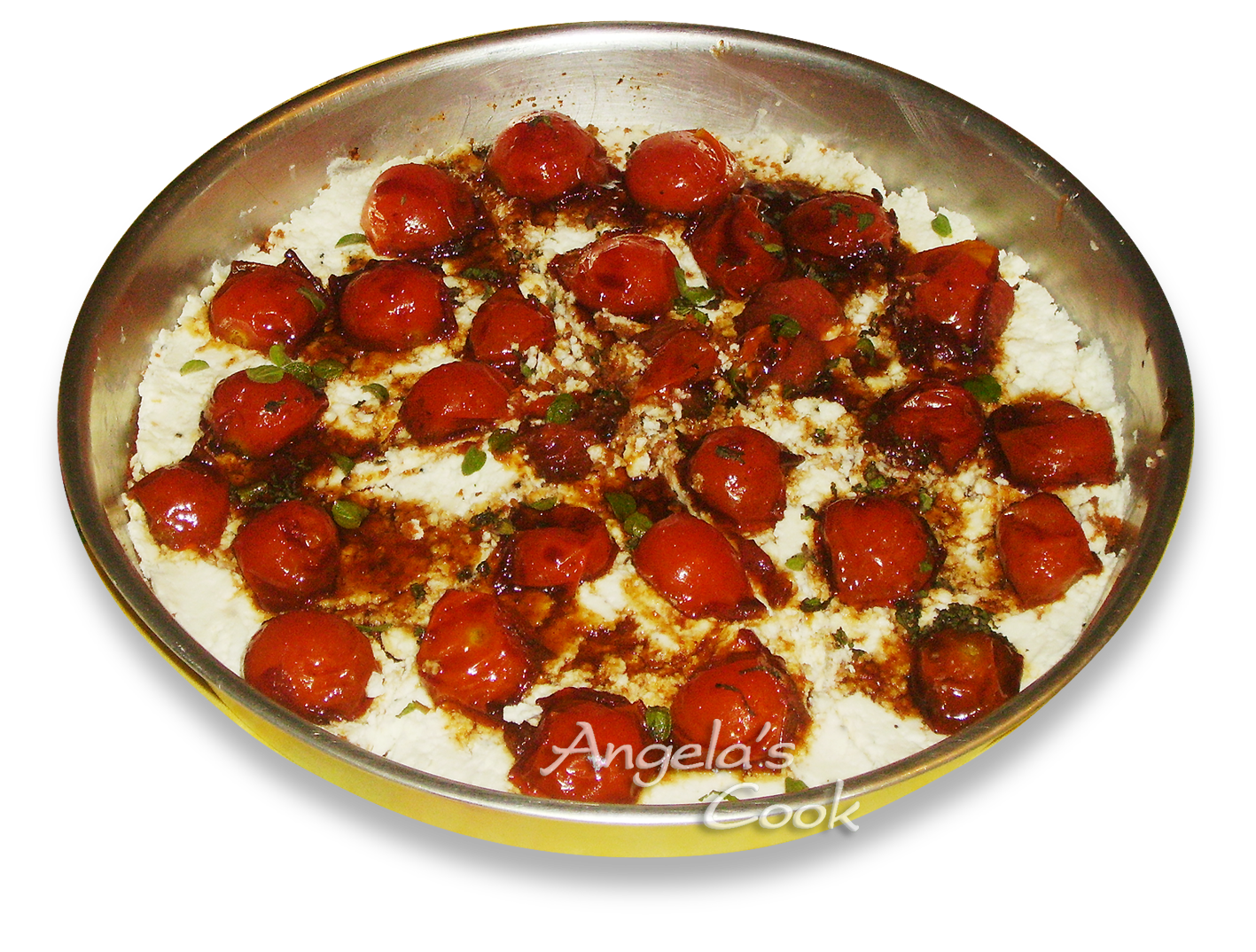 Αποσύρουμε το τηγάνι και στρώνουμε τα ντοματίνια με την καραμελωμένη σάλτσα πάνω από τα τυριά. Τέλος πασπαλίζουμε με την ρίγανη και τον φρέσκο δυόσμο.