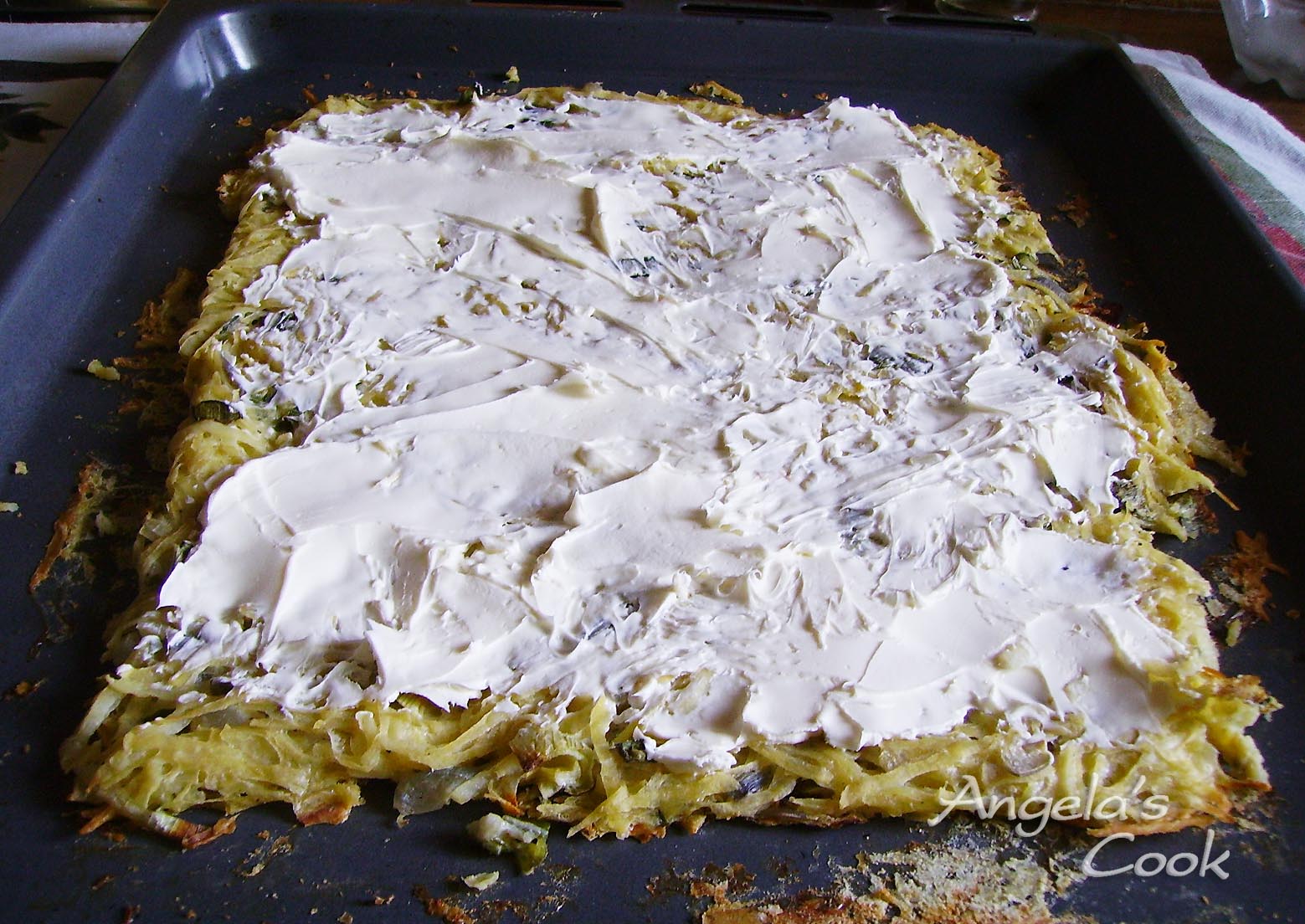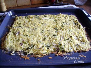Καθαρίζουμε τις πατάτες και τις τρίβουμε στο τρίφτη. Ψιλοκόβουμε τα κρεμμύδια και τα ανακατεύουμε με τις πατάτες, χτυπάμε τα αυγά και τα ενώνουμε με τις πατάτες. Παίρνουμε μια λαδόκολλα την τοποθετούμε σε ένα ταψί και απλώνουμε το μείγμα σε παραλληλόγραμμο σχήμα, το πατάμε με το πίσω μέρος του κουταλιού έτσι ώστε να έχει το ίδιο πάχος. Ψήνουμε σε προθερμασμένο φούρνο στους 200 βαθμούς για 30 λεπτά.