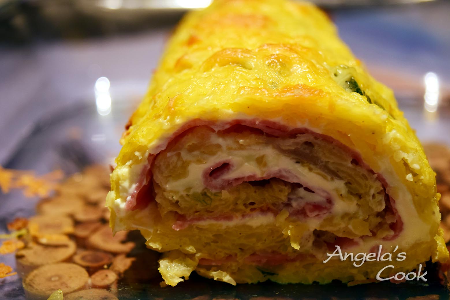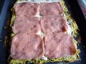 Το βγάζουμε από το φούρνο και το αφήνουμε να κρυώσει. Ξεκολλάμε προσεκτικά από τη λαδόκολλα χωρίς να το πάρουμε από επάνω. Αλείφουμε την κρέμα τυριού όλη την επιφάνεια και απλώνουμε τις φέτες ζαμπόν.