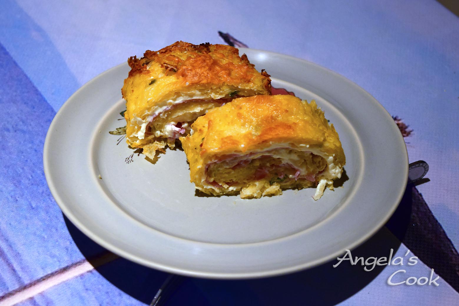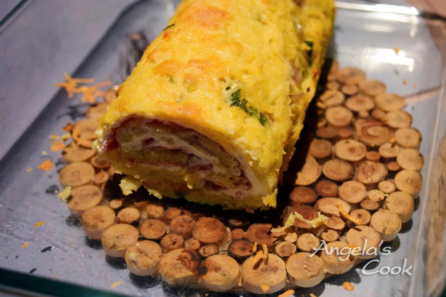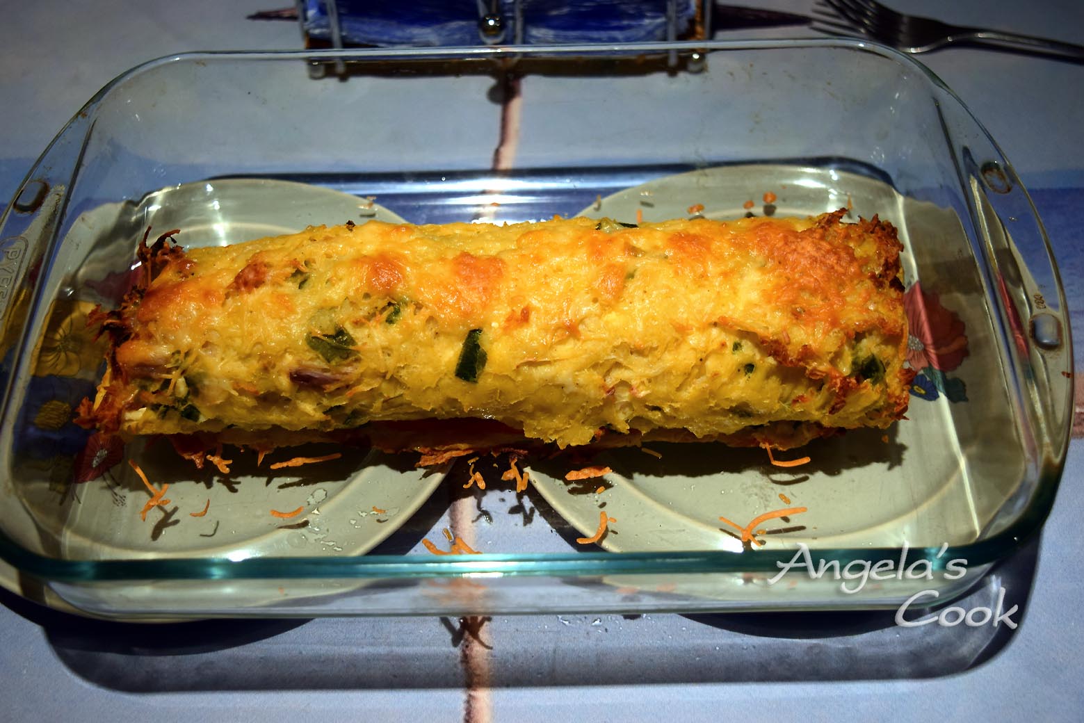 Το γυρνάμε σε ρολό και το τοποθετούμε σε ένα ταψί με το άνοιγμα του ρολού στο κάτω μέρος. Πασπαλίζουμε με τριμμένο τυρί και γκρατινάρουμε για 1/4 στο φούρνο. Αφήνουμε λίγο να κρυώσει και κόβουμε σε ροδέλες.