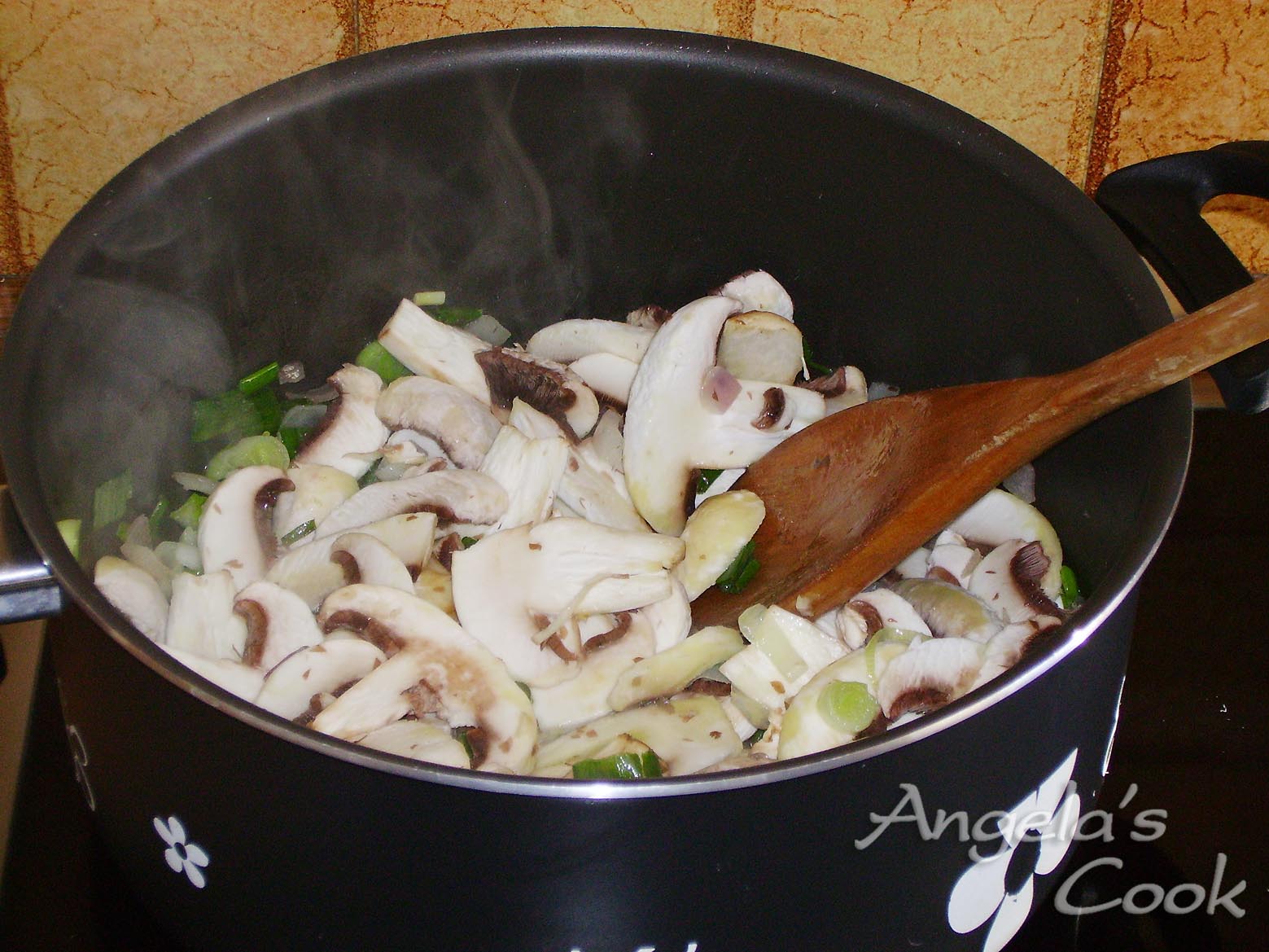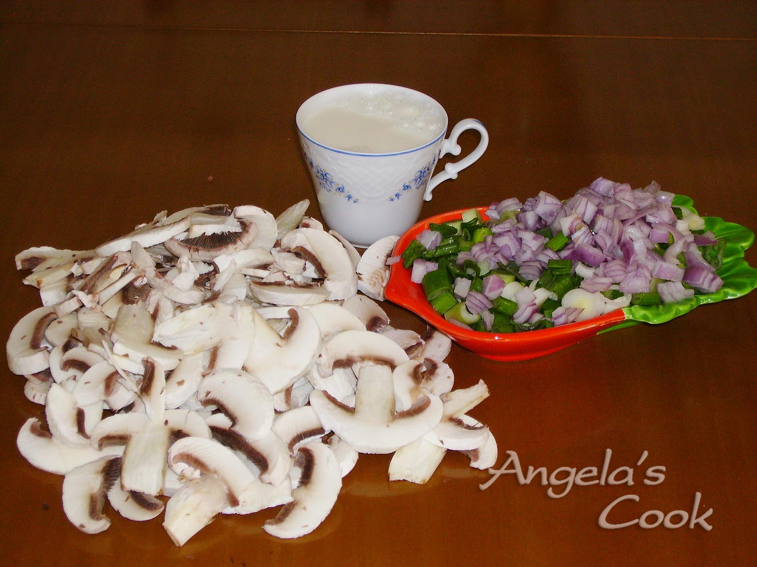 Ψιλοκόβουμε τα κρεμμύδια. Καθαρίζουμε τα μανιτάρια με βρεγμένο χαρτί κουζίνας και τα κόβουμε φέτες. Σε μια κατσαρόλα βάζουμε το λάδι να κάψει. Ρίχνουμε τα κρεμμύδια και τα αφήνουμε 10 λεπτά να μαλακώσουν. Προσθέτουμε τα μανιτάρια και μόλις πιούν τα υγρά τους,πασπαλίζουμε με την κουταλιά το αλεύρι. Στη συνέχεια ρίχνουμε το γάλα το νερό και τον κύβο θρυμματισμένο. Μόλις πάρει μια βράση ρίχνουμε το αλάτι, το πιπέρι και το μοσχοκάρυδο. Αφήνουμε 10 λεπτά ακόμη να βράσει.