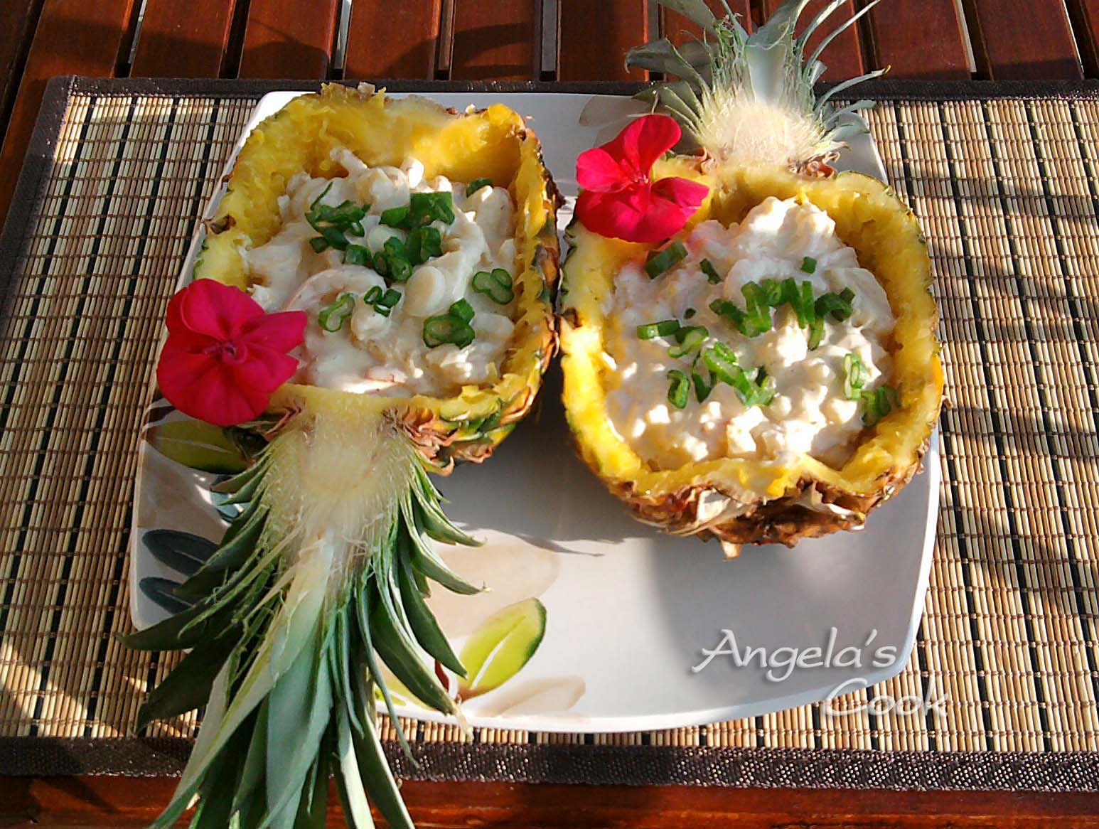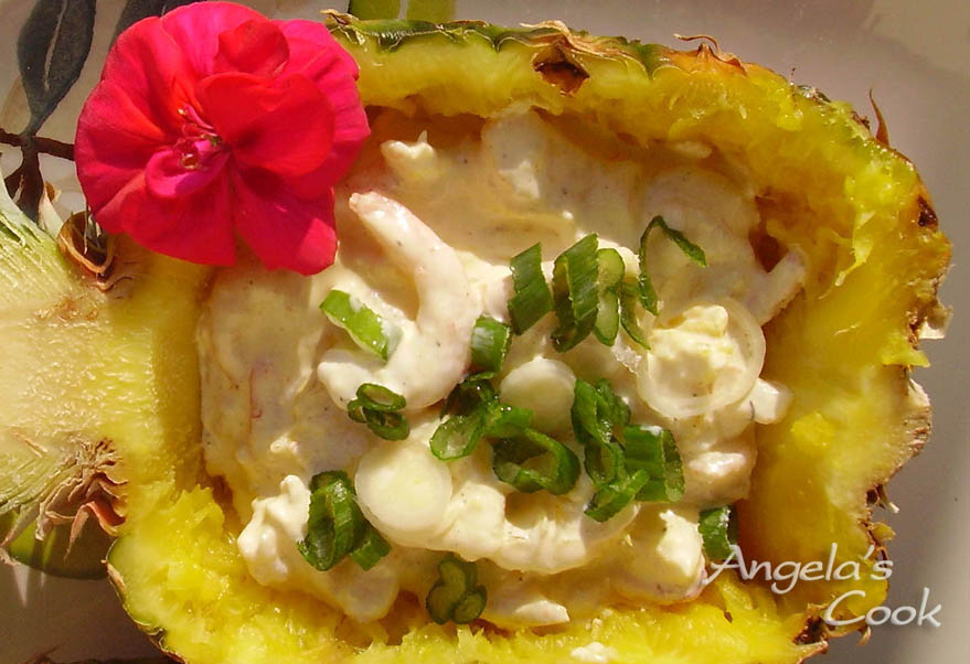 Τον κομμένο ανανά και τα κομματάκια του ραντίζουμε με χυμό λεμονιού για να μην μαυρίσουν. Μπορούμε να χρησιμοποιήσουμε φρέσκες ή κατεψυγμένες γαρίδες αλλά όχι προβρασμένες. Επίσης ανανά μπορούμε να χρησιμοποιήσουμε και κονσέρβα, αλλά δεν θα έχουμε τέτοια παρουσίαση, και η γεύση του φρέσκου ανανά σίγουρα διαφέρει από της κονσέρβας. Συνοδεύεται από λευκό κρασί ή ένα αφρώδες.