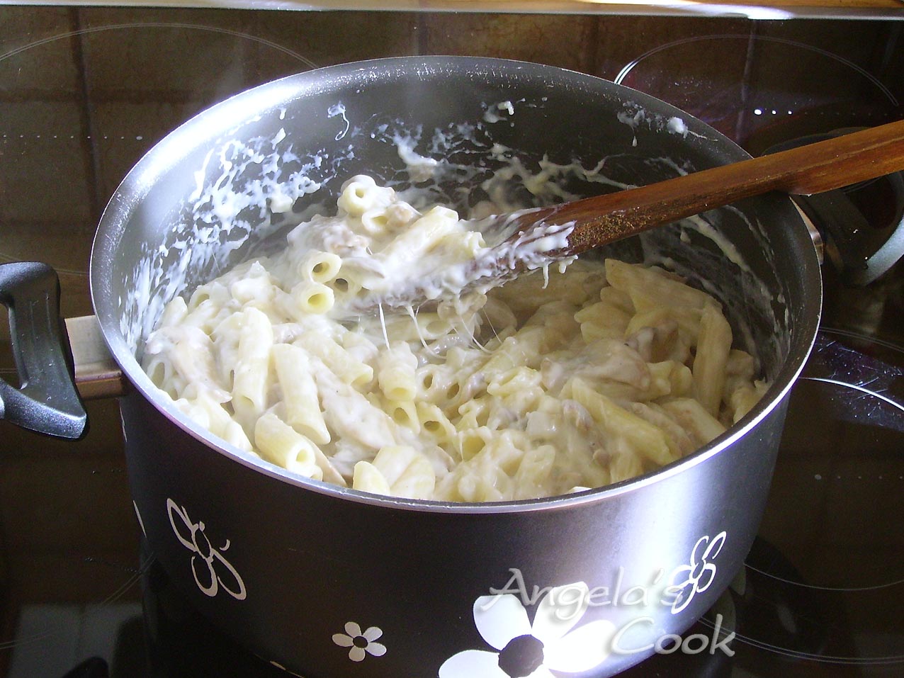 Ρίχνουμε το μισό τυρί και τα μακαρόνια.Ανακατεύουμε καλά.