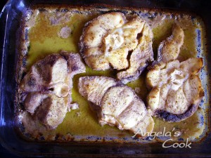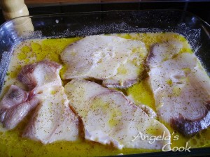Τοποθετούμε τις φέτες του ψαριού στο ταψί ή σε πυρέξ. Αλατοπιπερώνουμε.