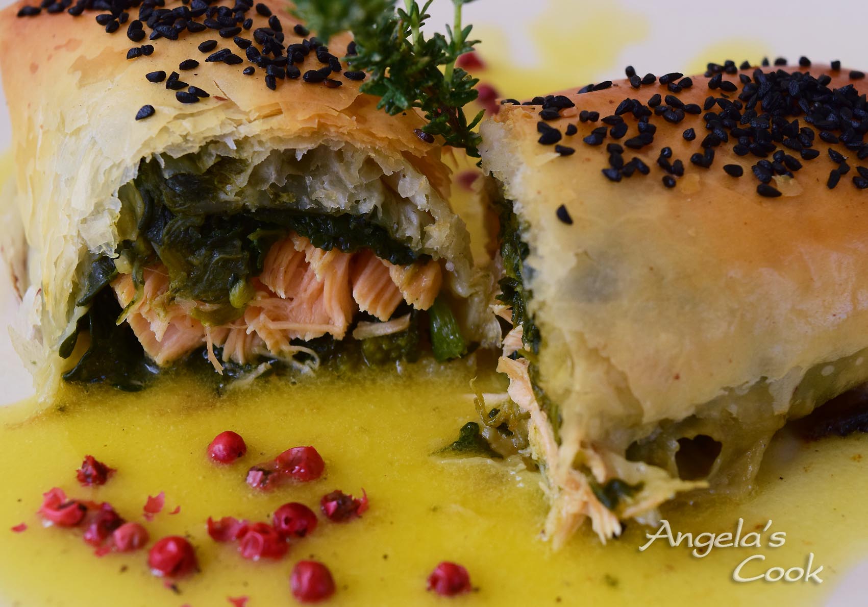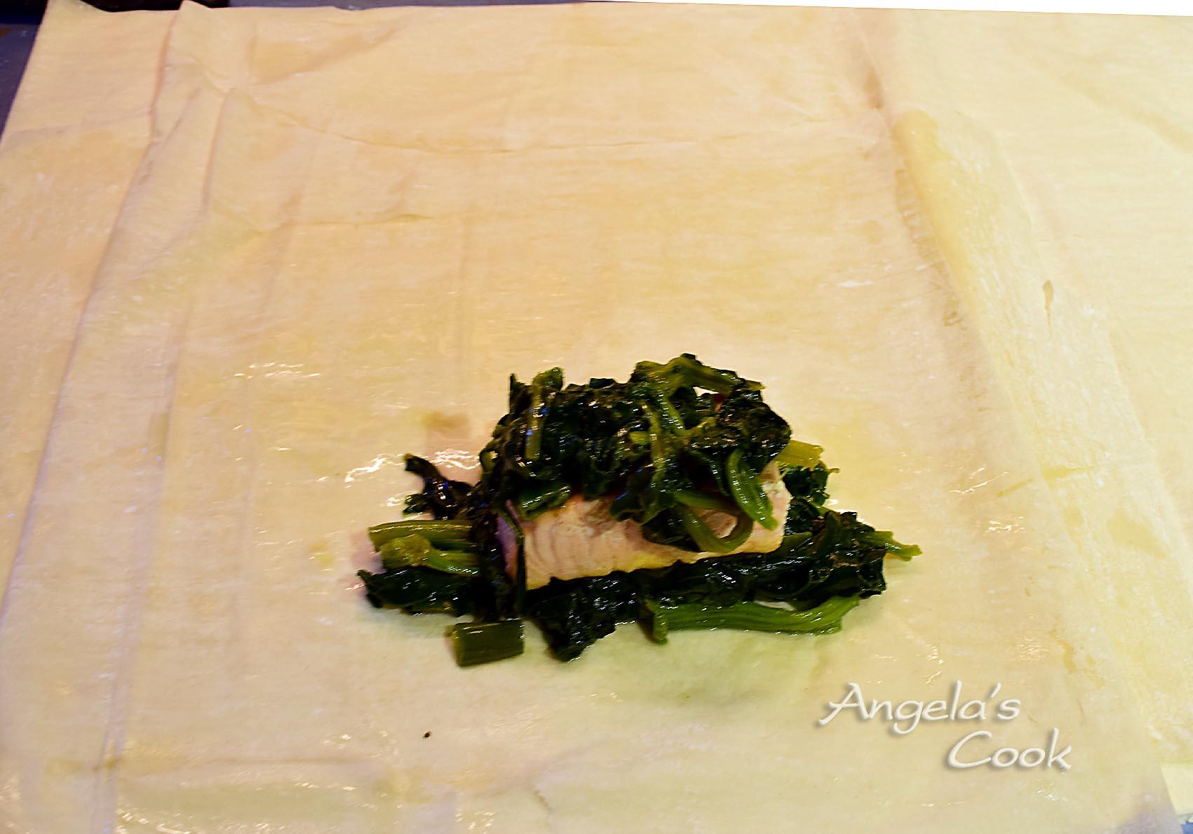 Αφήνουμε να κρυώσει. Παίρνουμε δυο φύλλα τα λαδώνουμε με ένα πινελάκι τοποθετούμε λίγο μείγμα σπανακιού και επάνω ένα φιλέτο σολομό.