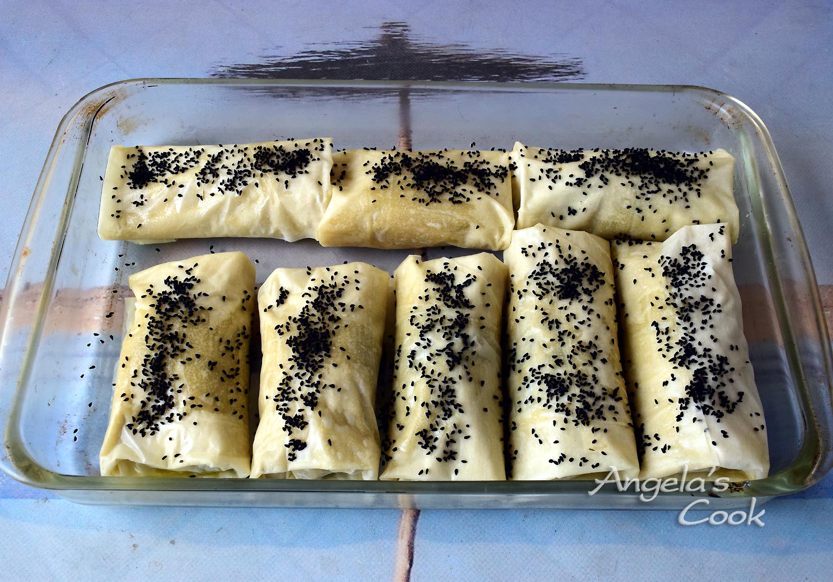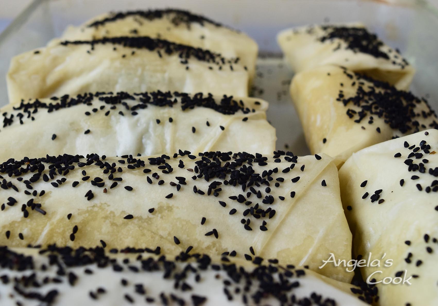 Βάζουμε τα πακετάκια σε λαδωμένο ταψί τα λαδώνουμε επάνω με το πινέλο, πασπαλίζουμε με σουσάμι και ψήνουμε σε προθερμασμένο φούρνο για 20 λεπτά μέχρι να ροδίσει το φύλλο μας.