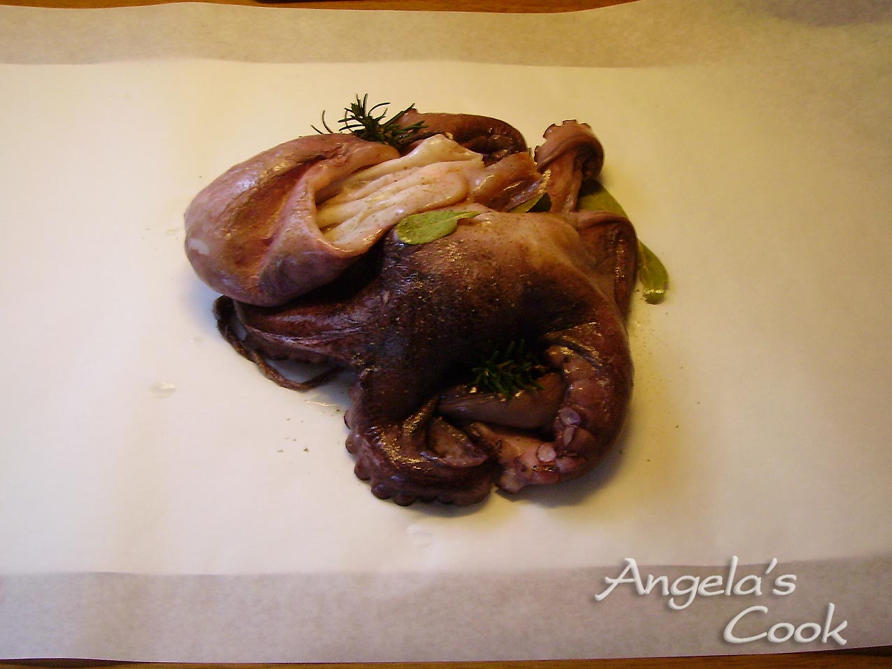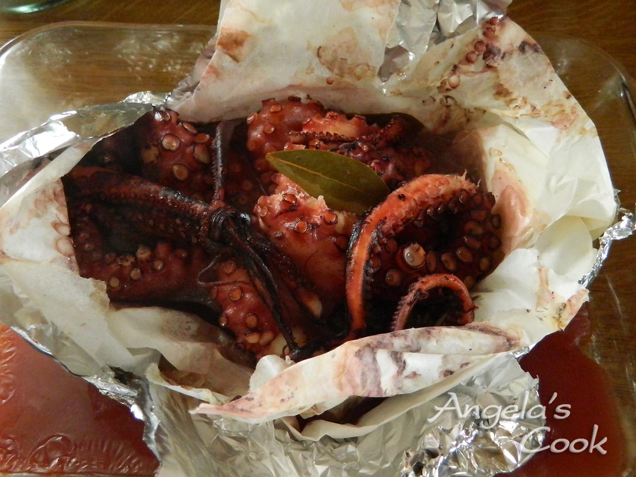 Πλένουμε και καθαρίζουμε καλά το χταπόδι.Βάζουμε ένα μεγάλο κομμάτι λαδόκολλα στο πάγκο μας και ακουμπάμε το χταπόδι, ρίχνουμε λίγο λάδι και πασπαλίζουμε με πιπέρι, δενδρολίβανο και τα φύλλα της δάφνης. Το κλείνουμε καλά όχι πολύ σφιχτά γιατί φουσκώνει και το τυλίγουμε και με αλουμινόχαρτο.