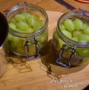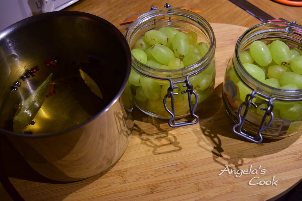 Αφαιρούμε τις ρώγες του σταφυλιού από τα κοτσάνια τους. Τα πλένουμε καλά. Τα τοποθετούμε σε αποστειρωμένο βάζο.Σε μια κατσαρόλα βάζουμε όλα τα υλικά και βράζουμε για 5 λεπτά σε μέτρια φωτιά. Αφήνουμε να κρυώσει καλά και γεμίζουμε το βάζο μας μέχρι επάνω να καλυφθούν τα σταφύλια.