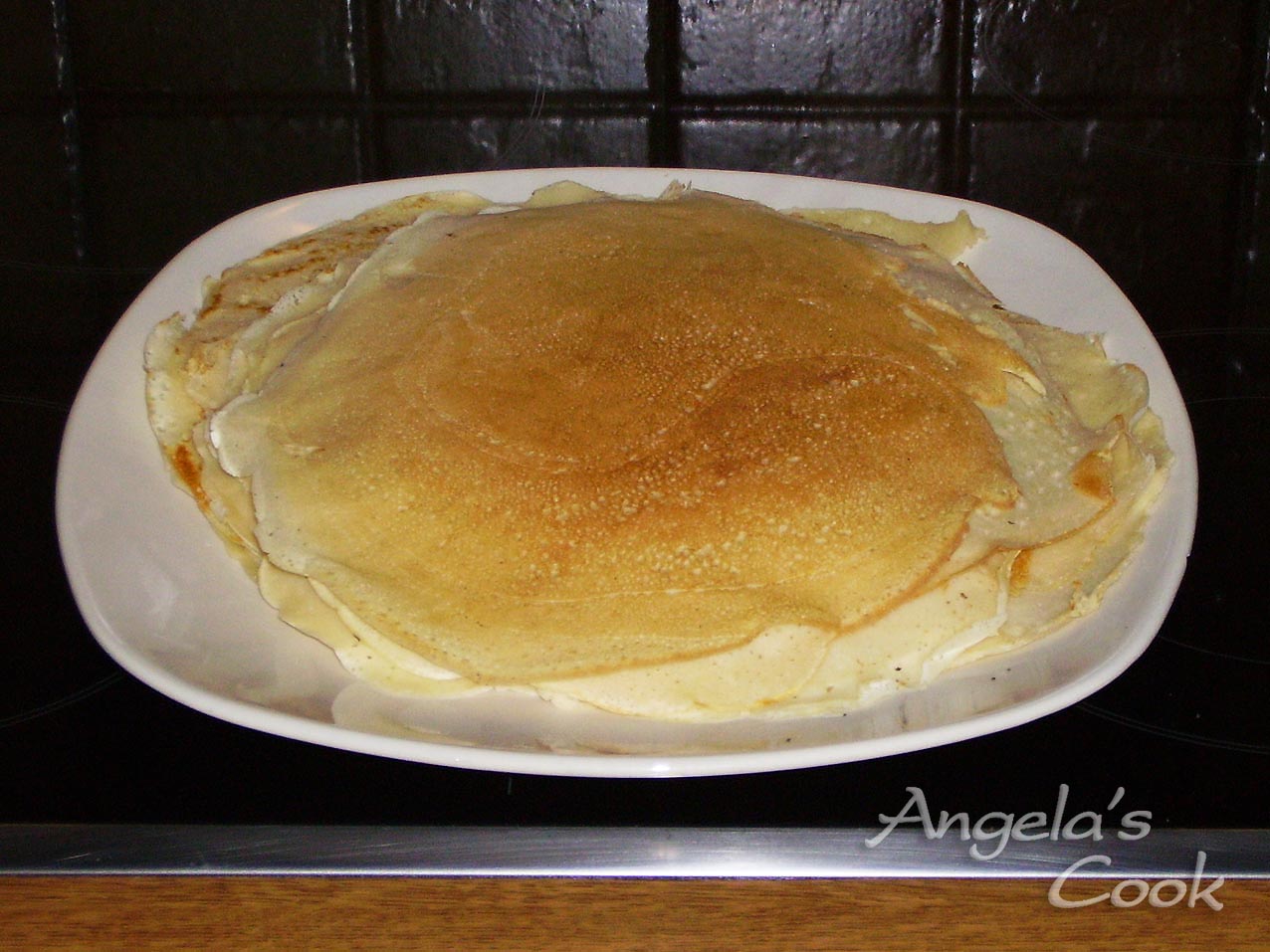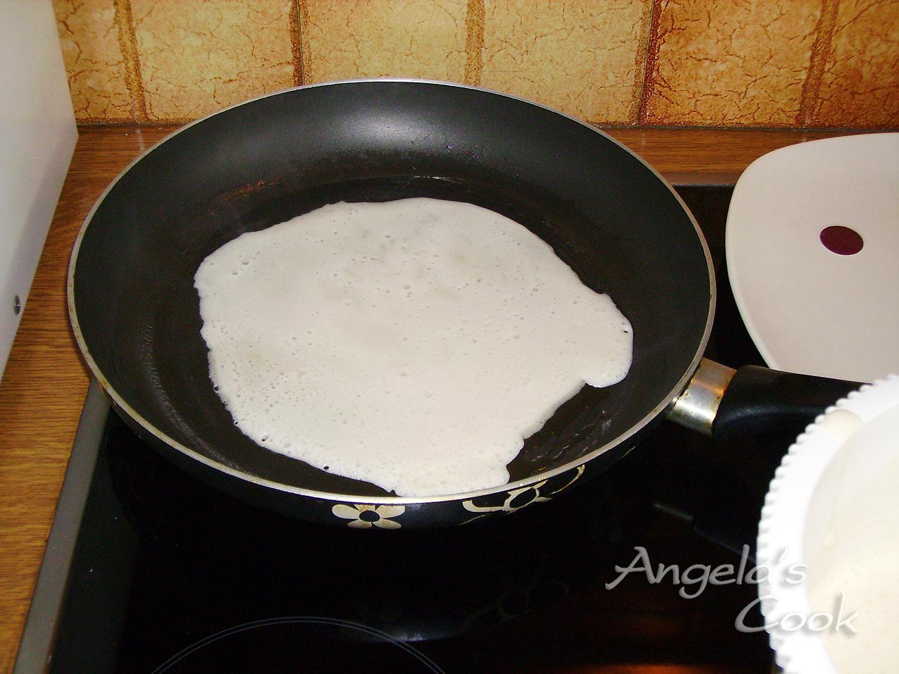 Σε μπολ ανακατεύουμε όλα τα υλικά μας. αφήνουμε το χυλό για μισή ώρα να ξεκουραστεί. Σε αντικολλητικό τηγανάκι αφού ζεσταθεί ρίχνουμε ένα φλιτζανάκι του καφέ από το χυλό περιμετρικά να πιάσει όλο τον πάτο του τηγανιού.