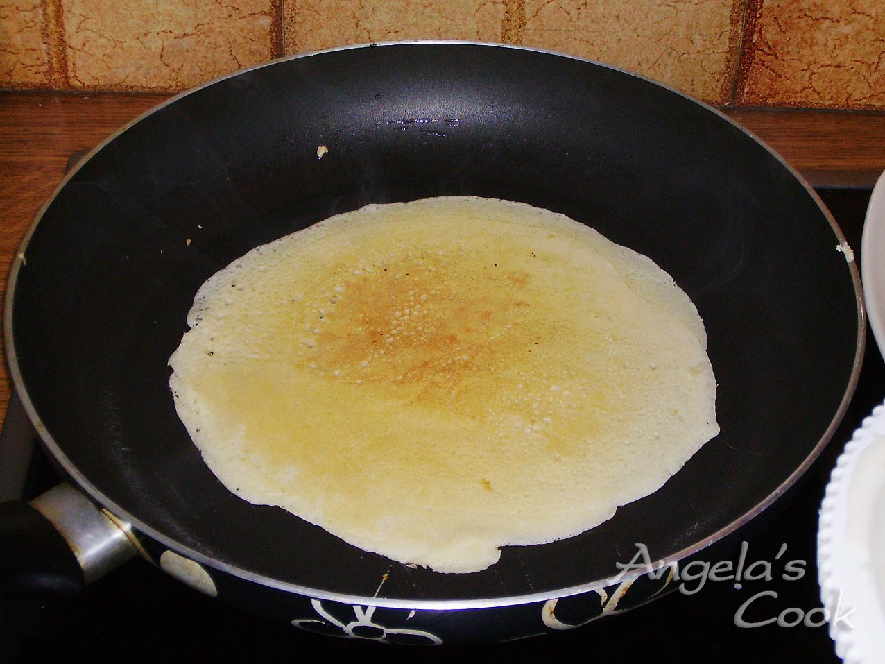 Το αφήνουμε μέχρι να ξεκολλήσει και γυρίζουμε από την άλλη μεριά, για να πάρει χρώμα. Βγάζουμε την κρέπα και συνεχίζουμε. Γίνονται 8 με 10 κρέπες περίπου.