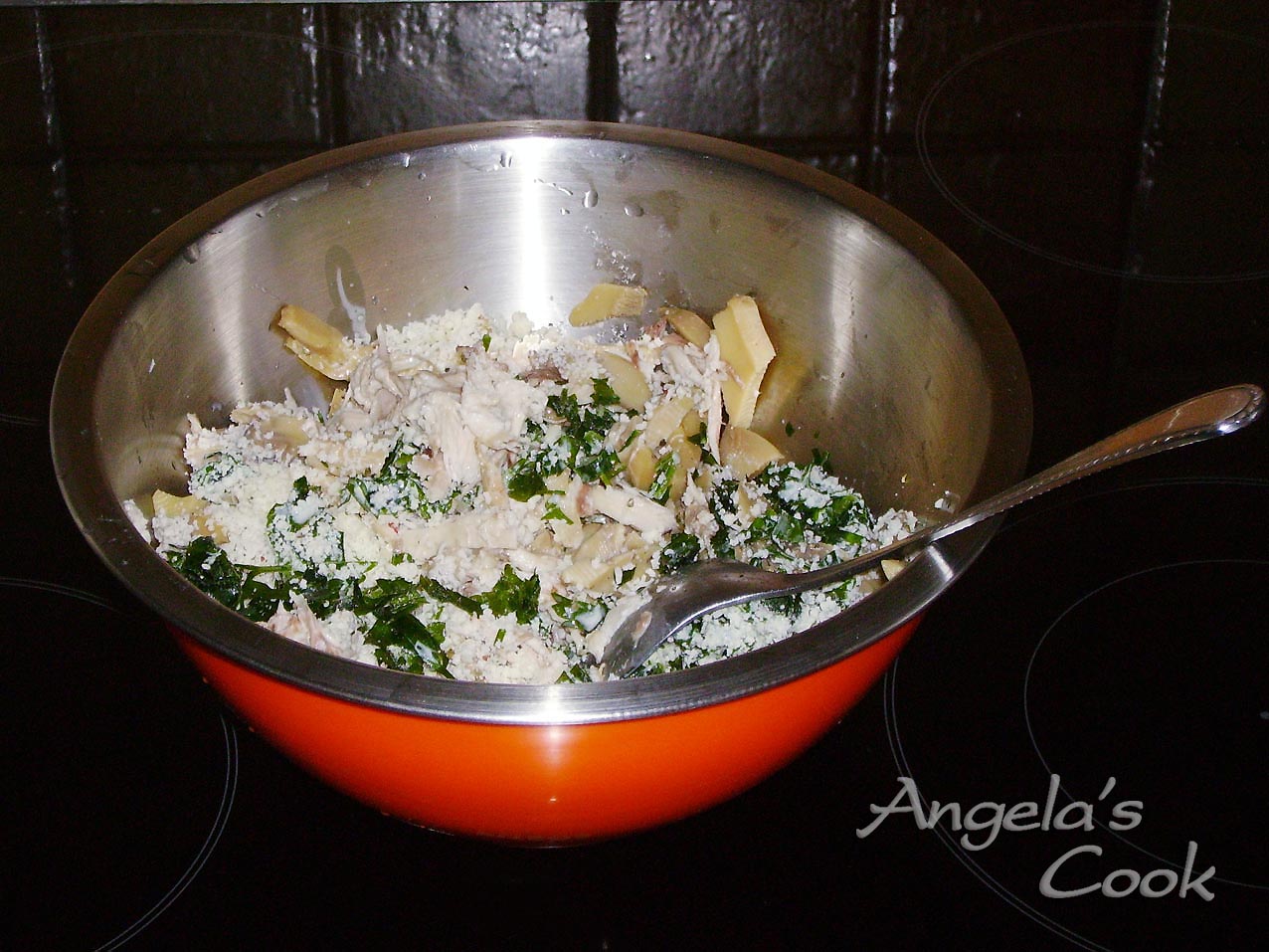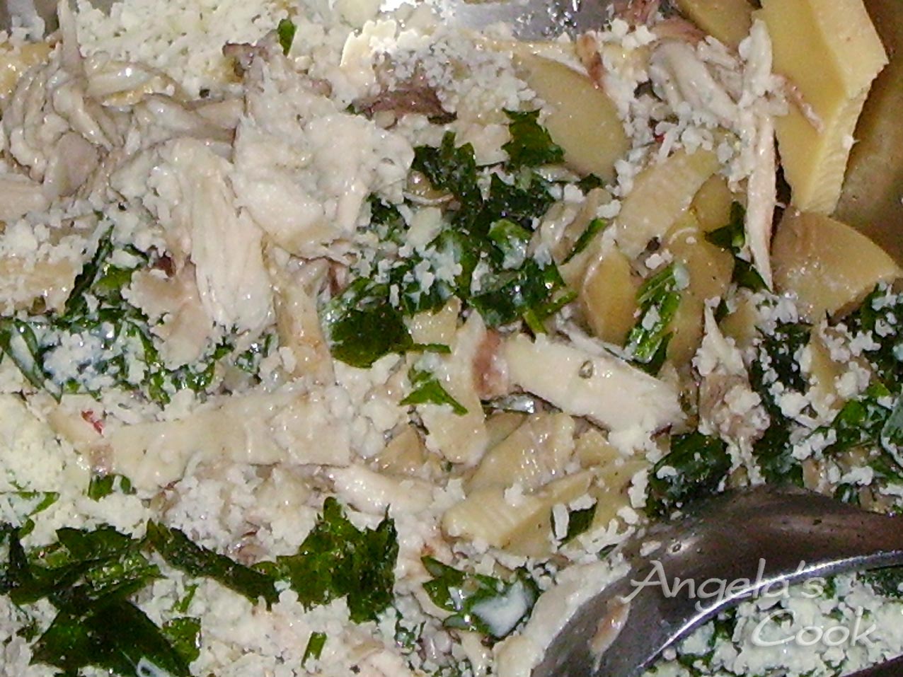 Βράζουμε το κοτόπουλο σε αλατισμένο νερό. Το ξεκοκαλίζουμε και το μαδάμε σε μικρά κομματάκια. Προσθέτουμε την κρέμα γάλακτος, τα μανιτάρια, το μαϊντανό, πιπέρι και το τυρί.
