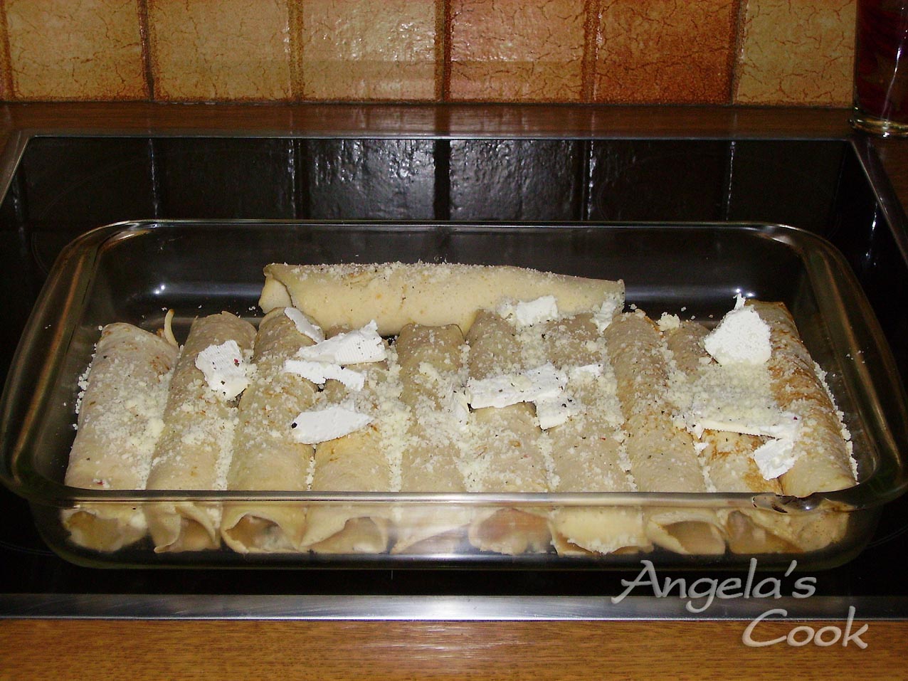 Τυλίγουμε μέσα στις κρέπες την γέμιση,τις τοποθετούμε σε πυρέξ. Ρίχνουμε ανάμεσά τους το βούτυρο και πασπαλίζουμε με το τριμμένο τυρί. Ψήνουμε στους 200 βαθμούς μέχρι να γκρατιναριστεί το τυρί.