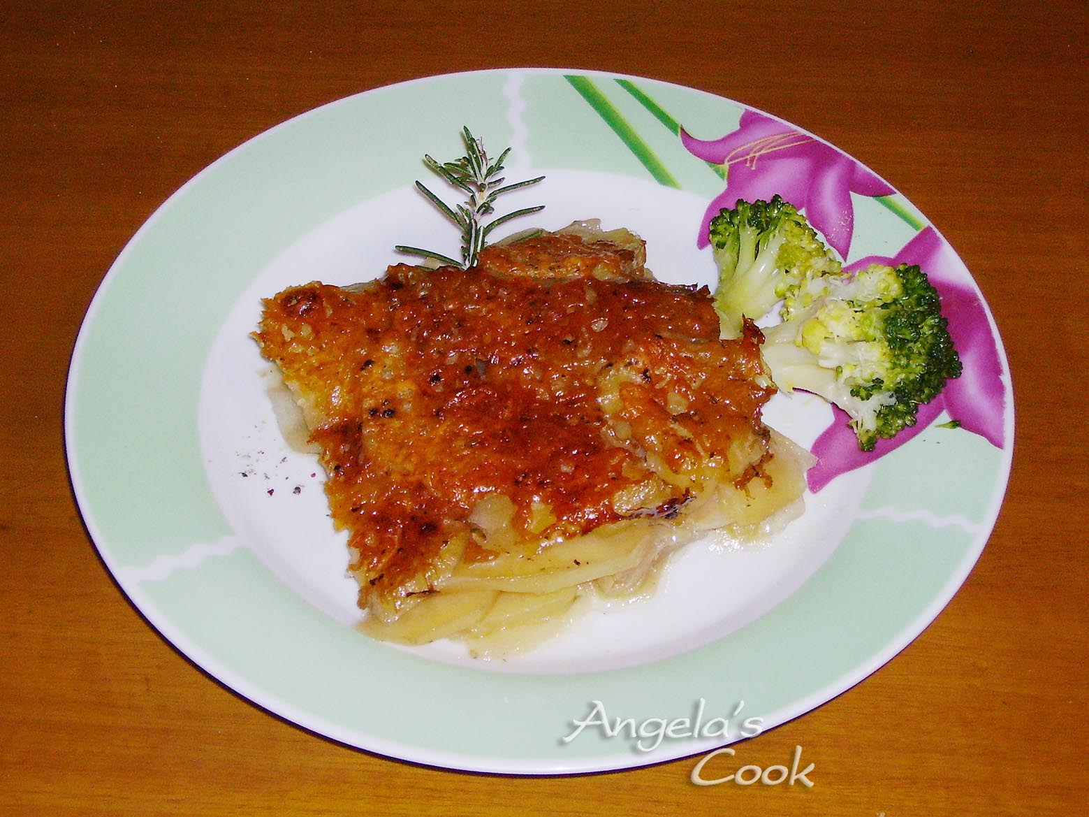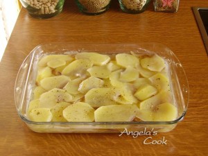 Βουτυρώνουμε ένα πυρέξ, στρώνουμε μια δόση πατάτες και από επάνω ρίχνουμε σκόρπια κουταλιές από τα κρεμμύδια. Συνεχίζουμε τις στρώσεις μέχρι να τελειώσουν τα υλικά μας.