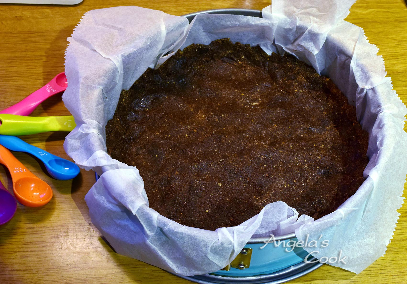 Στο μούλτι χτυπάμε τους ξηρούς καρπούς και τις φρυγανιές μέχρι να γίνουν σκόνη. Λιώνουμε τη μαργαρίνη την αφήνουμε λίγο να κρυώσει και την ανακατεύουμε με τους ξηρούς καρπούς, το κακάο, και το μέλι. Σε μια ταρτιέρα στρώνουμε λαδόκολλα αδειάζουμε το μείγμα και το πατάμε με το πίσω μέρος του κουταλιού να ισιώσει ανεβάζοντας τα πλαϊνά γύρω γύρω για να μπει η κρέμα. Το βάζουμε στην κατάψυξη για 10 λεπτά.